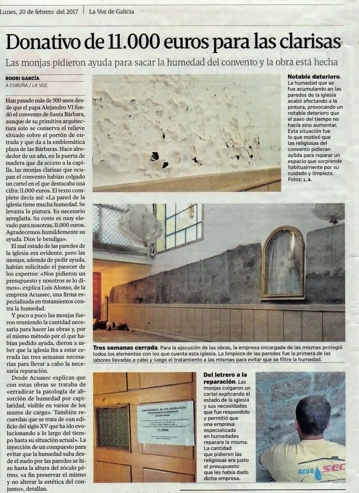La prensa escrita se hizo eco de la obras que realizamos para eliminar las humedades por capilaridad en el Convento de Santa Bárbara (A Coruña).
